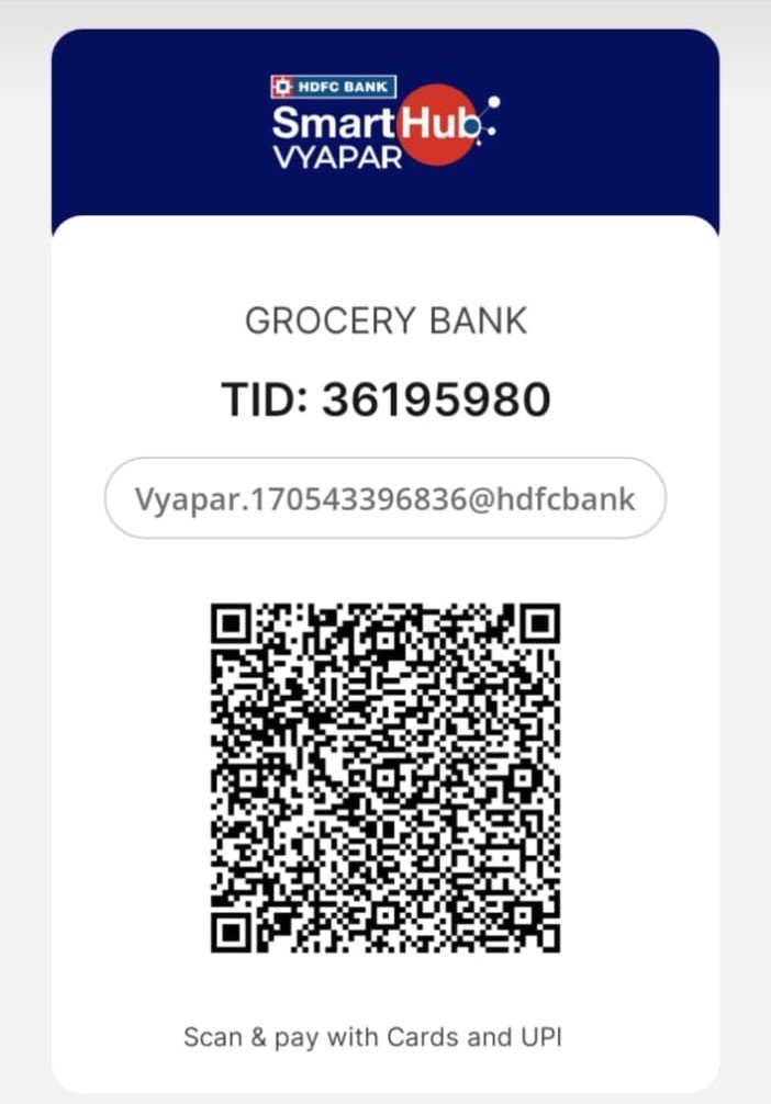 Account Holder: GROCERY BANK Account Number: 50200091037271 IFSC: HDFC0009632 Branch: KHERWARA Account Type: CURRENT